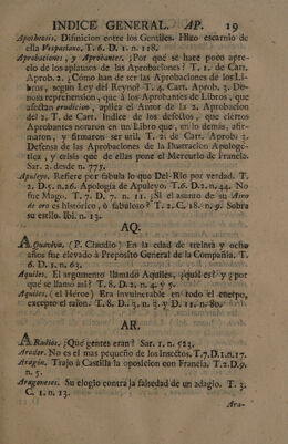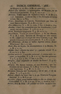 Indice general alfabetico, de las cosas notables, que contienen todas las obras del muy ilustre Señor D. Fr. Benito Geronimo Feijoó : inclusas las dedicatorias, aprobaciones, y prologos, y tambien los dos tomos de la Demonstracion critico-apologética, que en defensa del Teatro critico escribió el Rmo. P.M.D.Fr. Martin Sarmiento / Dispuesto por Don Joseph Santos.