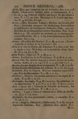 Credit: Indice general alfabetico, de las cosas notables, que contienen todas las obras del muy ilustre Señor D. Fr. Benito Geronimo Feijoó : inclusas las dedicatorias, aprobaciones, y prologos, y tambien los dos tomos de la Demonstracion critico-apologética, que en defensa del Teatro critico escribió el Rmo. P.M.D.Fr. Martin Sarmiento / Dispuesto por Don Joseph Santos. Source: Wellcome Collection.