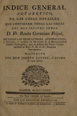 Indice general alfabetico, de las cosas notables, que contienen todas las obras del muy ilustre Señor D. Fr. Benito Geronimo Feijoó : inclusas las dedicatorias, aprobaciones, y prologos, y tambien los dos tomos de la Demonstracion critico-apologética, que en defensa del Teatro critico escribió el Rmo. P.M.D.Fr. Martin Sarmiento / Dispuesto por Don Joseph Santos.