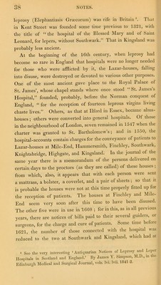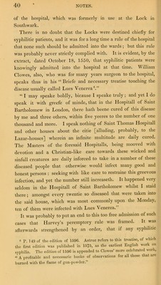 ![of the hospital, which was formerly in use at the Lock in Southwark. There is no doubt that the Locks were destined chiefly for syphilitic patients, and it was for a long time a rule of the hospital that none such should be admitted into the wards; but this rule was probably never strictly complied with. It is evident, by the extract, dated October 18, 1550, that syphilitic patients were knowingly admitted into the hospital at that time. William Clowes, also, who was for many years surgeon to the hospital, speaks thus in his “ Briefe and necessary treatise touching the disease usually called Lues Venerea®.” “ I may speake boldly, bicause I speake truly; and yet I do speak it with greefe of minde, that in the Hospitall of Saint Bartholomew in London, there hath beene cured of this disease by me and three others, within five yeeres to the number of one thousand and more. I speak nothing of Saint Thomas Hospitall and other houses about the citie [alluding, probably, to the Lazar-houses] wherein an infinite multitude are daily cured. The Masters of the foresaid Hospitalls, being mooved with devotion and a Christian-like care towards tliese wicked and sinfull creatures are daily inforced to take in a number of these diseased people that otherwise would infect many good and honest persons : seeking with like care to restraine this greevous infection, and yet the number still increaseth. It happened very seldom in the Hospitall of Saint Bartholomew whilst I staid there ^ amongst every twentie so diseased that were taken into the said house, which was most commonly upon the Monday, ten of them were infected with Lues Venerea.” It was probably to put an end to this too free admission of such cases that Harvey’s peremptory rule was framed. It was afterwards strengthened by an order, that if any syphilitic ® P. 140 of tho edition of 1696. Astruc refers to this treatise, of which the first edition was published in 1575, as the earliest English work on sypliilis. The edition of 1500 is appended to Clowes’ more celebrated work, “ A profitable and neccssarie booko of observations for all those that are burned with the flame of gun-powder.”](https://iiif.wellcomecollection.org/image/b22371898_0050.jp2/full/800%2C/0/default.jpg)
