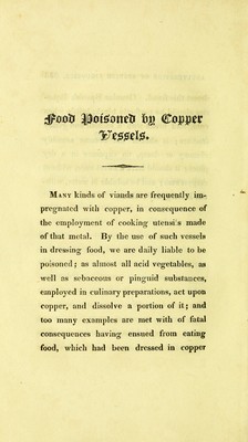 Credit: A treatise on adulterations of food, and culinary poisons : exhibiting the fraudulent sophistications of bread, beer, wine, spirituous liquors, tea, coffee, cream, confectionery, vinegar, mustard, pepper, cheese, olive oil, pickles, and other articles employed in domestic economy, and methods of detecting them ... / by Frederick Accum. Source: Wellcome Collection.