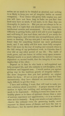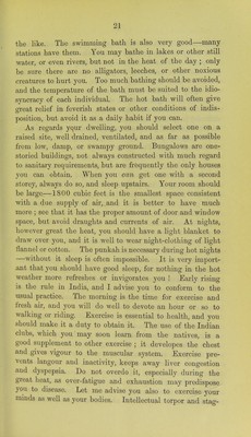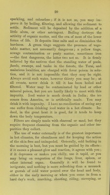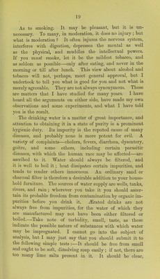 ![]9 As to smoking. It may be pleasant, but it is un- necessary. To many, in moderation, it does no injury; but what is moderation ? It often injures the nervous system, interferes with digestion, depresses the mental as well as the physical, and muddles the intellectual powers. If you must smoke, let it be the mildest tobacco, and as seldom as possible—only after eating, and never in the morning or till after lunch. This view about alcohol and tobacco will not, perhaps, meet general approval, but I undertook to tell you what is good for you and not what is merely agreeable. They are not always synonymous. These are matters that I have studied for many years. I have heard all the arguments on either side, have made my own observations and some experiments, and what I have told you is the result. The drinking water is a matter of great importance, and attention to obtaining it in a state of purity is a prominent hygienic duty. Its impurity is the reputed cause of many diseases, and probably none is more potent for evil. A variety of complaints—cholera, fevers, diarrhoea, dysentery, goitre, and some others, including certain parasitic diseases, with which the human race may be affected—are ascribed to it. Water should always be filtered, and it is well to boil it; heat dissipates certain impurities, and tends to render others innocuous. An ordinary sand or charcoal filter is therefore a desirable addition to your house- hold furniture. The sources of water supply are wells, tanks, rivers, and rain ; wherever you take it you should ascer- tain its probable freedom from contamination by organic im- purities before you drink it. iErated drinks are not always free from impurities, for the water of which tbey are manufactured may not have been either filtered or boiled.—Take note of turbidity, smell, taste, as these indicate the possible nature of substances with which water may be impregnated. I cannot go into the subject of analysis, but I may just say that you should submit it to the following simple tests :—It should be free from smell and ought to be soft, dissolving soap easily ; if not, there are too many lime salts present in it. It should be clear.](https://iiif.wellcomecollection.org/image/b22305348_0021.jp2/full/800%2C/0/default.jpg)