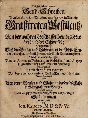 Einiger Medicorum Schreiben, von der in Preussen An. 1708, in Dantzig An. 1709, in Rosenberg An. 1708, und in Fraustadt An. 1709, grassireten Pest: wie auch von der wahren Beschaffenheit des Brechens, des Schweisses, und der Pest-Schwären, sonderlich der Beulen: und ... von rechtem Gebrauch der Vomitoriorum und Sudoriferorum / [Johann Kanold].