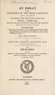 An essay on the antiquity of the Irish language; being a collation of the Irish with the Punic language / With a preface, proving Ireland to be the Thule of the ancients ... To which is added, a correction of the mistakes of Mr. Lhwyd ... and of ... Mr. Baretti ... And, Remarks on the [Vallancey's] Essay on the antiquity of the Irish language ... addressed to the ... London Chronicle in ... 1772 [signed Celticus] ... By Charles Vallancey.