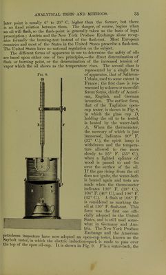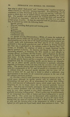 ![may remain in them. The fire-test of the solar oil is generally above 100° C, and they are in general both cheap and excellent burning oils. Parqffine Oil.—The paraffine itself has been described under a previous heading. The expressed paraffine oil is used considerably as a lubricating oil, but is of greatest importance for gas-making. The gas from this paraffine oil is especially rich in illuminating hydrocarbons and is free from the ordinary impurities of coal-gas. It is extensively manufactured in Germany, in the Hirzel and Pintsch forms of apparatus, and in England by the Pintsch, Keith, and Alexander & Patterson processes, and compressed for use in railway carriages, etc. Its characters will be referred to more especially under the heading of illuminating gases. 5. Vaseline.—This product (petrolatum of the United States Phar- macopoeia and unguentum parajini of the German Pharmacopoeia) may be obtained from several of the raw materials already mentioned. In the United States, as the name petrolatum indicates, it is a petroleum product and may be called natural vaseline, as it is merely a purified preparation of naturally existing petroleum constituents ; in Germany, and elsewhere in Europe, it is either extracted from other sources (pomade ozokerine), or, as the name unguentum paraffini indicates, it is an artificial vaseline made by the solution of paraffine in paraffine oil. American vaseline, as made by the Chesebrough Company and others, is gotten by taking a vacuum residuum (see p. 26) and, without any treatment with sulphuric acid or other chemicals, simply filtering it through heated bone-black. In this way the amorphous character of the hydrocarbons is not changed and no crys- talline paraffine is produced, as would be the case if it were a distillation product, and, moreover, no traces of sulphonic acids can remain from the acid treatment to interfere with its use as a basis of medicinal ointments. The petrolatum of the United States Pharmacopoeia may be either a soft variety, melting at 40° C. (104° F.), or a firmer variety, melting at 51° C. (125° F.). The German vaseline, or unguentum parqfini, is made by taking one part of ceresine (parajinum solidum) and dissolving it in three parts of a paraffine shale oil, known as vaseline oil {para]ffinum-liqmdum). This artificial vaseline, as Engler and Bohm have shown,* easily becomes granular on chilling, and shows its composite nature moreover by readily separating on distillation into ceresine and oil. The natural vaseline has greater homo- geneity and is more viscous, although at high temperatures it seems to absorb more oxygen then the artificial preparation. At temperatures not exceeding 30° C. the oxygen absorption seems to be practically nothing in either case. Vaseline is largely used in pharmacy and medical practice as a basis of ointments and pomades. IV. Analytical Tests and Methods. 1. For Natural Gas.—These are the methods employed for the analysis of all varieties of illuminating gas, and will be referred to under that headmg. (See p. 382.) 2. For Petroleum.—For liquids in general, the two constants most characteristic are specific gravity and boiling-point. For commercial petroleum products, which are, of course, mixtures of hydrocarbons, the second becomes of only secondary importance, while, with reference to tneir uses as illuminants, the element of safety comes into consideration, so * Dingier, Polytech. Journal, 262, p. 468. 3](https://iiif.wellcomecollection.org/image/b21906269_0043.jp2/full/800%2C/0/default.jpg)