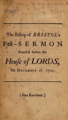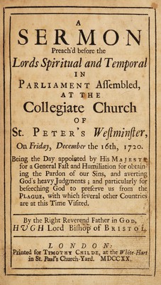A sermon preach'd before the Lords Spiritual and Temporal in Parliament assembled, at the collegiate church of St. Peter's Westminster, on Friday, December the 16th, 1720 : being the day appointed by His Majesty for a general fast and humiliation for obtaining the pardon of our sins, and averting God's heavy judgments; and particularly for beseeching God to preserve us from the plague, with which several other countries are at this time visited / by the Right Reverend Father in God, Hugh Lord Bishop of Bristol.
