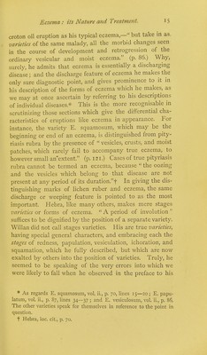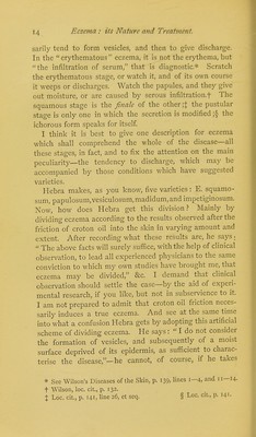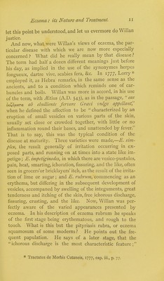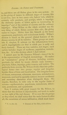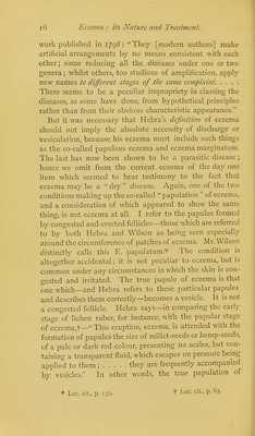 ![work published in 1798: They [modern authors] make artificial arrangements by no means consistent with each other; some reducing all the diseases under one or two genera; whilst others, too studious of amplification, apply new names to different stages of the same complaint. .... There seems to be a peculiar impropriety in classing the diseases, as some have done, from hypothetical principles rather than from their obvious characteristic appearance. But it was necessary that Hebra's definition of eczema should not imply the absolute necessity of discharge or vesiculation, because his eczema must include such things as the so-called papulous eczema and eczema marginatum. The last has now been shown to be a parasitic disease ; hence we omit from the current eczema of the day one item which seemed to bear testimony to the fact that eczema may be a dry disease. Again, one of the two conditions making up the so-called papulation of eczema, and a consideration of which appeared to show the same thing, is not eczema at all. I refer to the papules formed by congested and erected follicles—those which are referred to by both Hebra and Wilson as being seen especially around the circumference of patches of eczema. Mr. Wilson distinctly calls this E. papulatum* The condition is altogether accidental; it is not peculiar to eczema, but is common under any circumstances in which the skin is con- gested and irritated. The true papule of eczema is that one which—and Hebra refers to these particular papules and describes them correctly—becomes a vesicle. It is not a congested follicle. Hebra says—in comparing the early stage of lichen ruber, for instance, with the papular stage of eczema,t— This eruption, eczema, is attended with the formation of papules the size of millet-seeds or hemp-seeds, of a pale or dark red colour, presenting no scales, but con- taining a transparent fluid, which escapes on pressure being applied to them; they are frequently accompanied by vesicles. In other words, the true papulation of * Loc. cit., p. 132. f Loc. cit., p. 63.](https://iiif.wellcomecollection.org/image/b20422131_0024.jp2/full/800%2C/0/default.jpg)