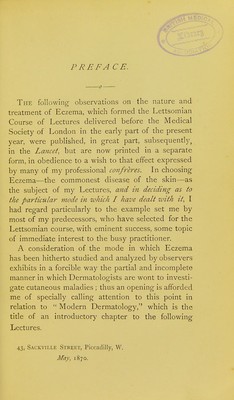Eczema, its nature and treatment : and incidentally, the influence of constitutional conditions on skin diseases being the Lettsomian lectures for the session 1869-70 delivered before the Medical Society of London / by Tilbury Fox.