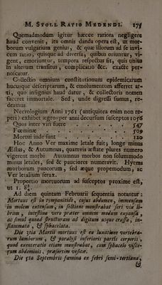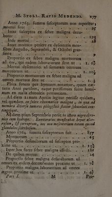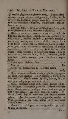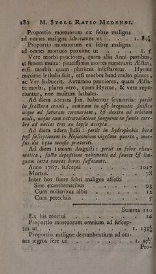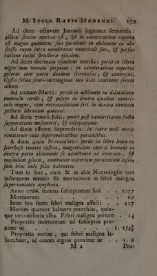 ![188 ]M.Srorr RAT:0 MEDENPDI; Proportio mortuorum ex febre maligna | ad omnes maligna laborantes ut... . 1:1. $43. Proportio mortuorum ex febre maligna. : ad omnes mortuos proxime ut... .. 0. Vere morbi pxuciores, quam alis Anni partibus, at funera multa: psuciffimas mortes numeravit /Eftas, | etfi; morbis quam plurimis infeftaretur. — Hyems - . maxime lethalis fuit, etfi morbos haud multo plurcs , / » ac Ver habuerit. Autumno pauciores, quam ZEfta- - te morbi, plures vero,: quam Hyeme, & vere repe- | riuntur, non multum lethales. L Ad diem zomam Jan. habentur (equentia: gerüt | in frattura cranii , mirum in offe bregmatis finiftvo | usque ad futuram coronariam , €2. dextro ad orbitam | eculi , usque cum evtrava[ationt fanguinis in fundo cere- bri ad uncias tres ex lapfu accepta. Ad diem zdam Julii: perit i bydrophobia bora: of? fufceptionem in Nofocomium vigefima quarta , mor- fus die 1yta menfis preteriti. 1 Ad diem r2mam Augufti : : perüt im febre rbeu- ; maiica , fatta depofitione vebementi ad. fauces €9 lins guam, intra paucas. boras. fuffocante., m Anno 1767. fufcepti ««« ul, dieta MIO 7] Mortut. i «1798 Inter hos fuere febri maligna affe&ti. ; Sine: exanthematibus ^. Lislese Com Sa ;Cuur, miliatibus; albis? socia me oq 12 Cum petechis — . : $2, bb pns 73 — M sn ; Summa IIO. ,Ex his mortui .. | 1 2o 10 Proportio mortuorum omnium ad fufcep- tos ut LJ LI . . Proportio maligne decumbentium ad om- hcs gros fere ubiuc«a 2100 gormdo *ao tul](https://iiif.wellcomecollection.org/image/b28776628_0001_0192.jp2/full/800%2C/0/default.jpg)