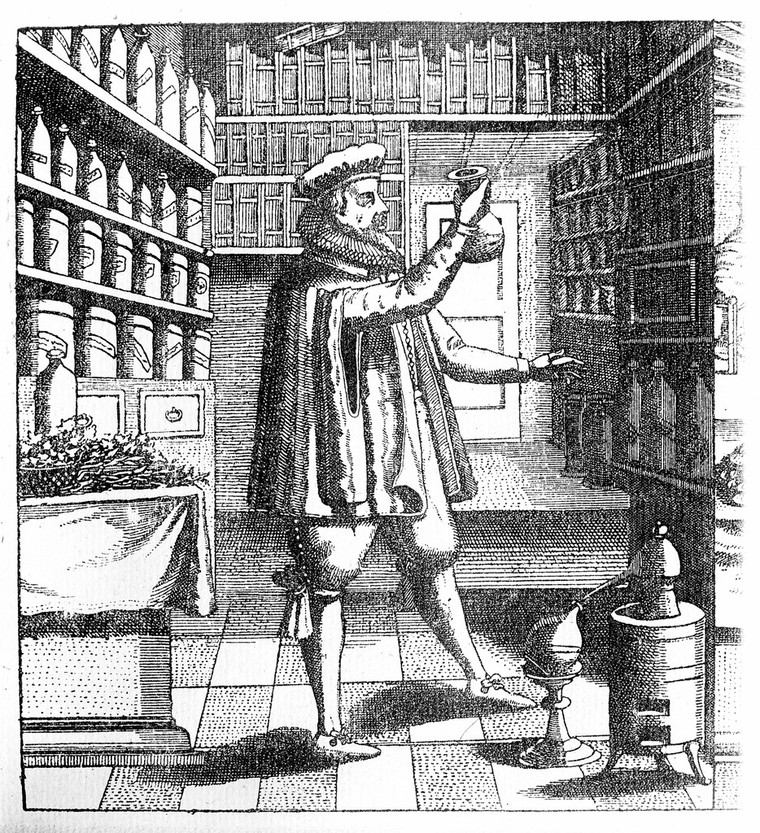M0007386: Illustration of a laboratory and library of an apothecary. In copyright. Source: Wellcome Collection.