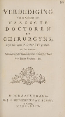 Verdediging van de Collegien der Haagsche Doctoren en Chirurgyns, tegen des Heeren P. Lyonnets geschrift, ten titel voerende: Verlaaring der geneezingen in's Haage gedaan door Jaques [sic] Rainaud.