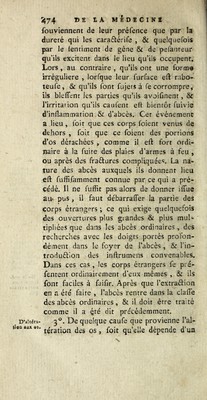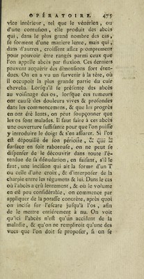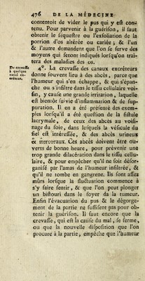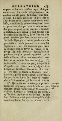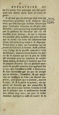 ![douleur , on ôte les emplâtres ; & fi le pus ne s’échappe pas à travers l’efcare , on la fend avec le biftouri, dans la vue de faciliter l’évacuation de cette humeur. J’ai fouvent attendu que le pus foriît de lui- même , & je m’en fuis bien trouvé , parce 4]ue la tumeur fe vidint peu à peu , les parois s’en rapprochoient à mefure qu’eile fe remplifîbit^ & parce que l’air n’y trou- voit pas l’accès qu’on lui procure lorfque le pus s’échappe promptement. Il n’eft au- cun praticien qui n’ait obfervé combien l’air eft nuifible, lorfqu’il s’introduit dans le foyer des abcès de la nature de ceux dont il s’agit ici. Bientôt l’efcare fe détache, le pus coule, le foyer de l’abcès fe dégorge, il diminue de capacité, fes parois fe recol- lent, & l’ouverture qui y a été faite fe ferme & fe cicatrife. Maniéré Les abcès qui font faits par un tranf- fbcèreriu- port d’humeurs, ou qui font la fuite d’une eux’qîi maladie, tels que ceux qui arrivent li an”dé>u?e^ fréquemment aux parotides à la fuite des ment d'hu- fièvtes maliffues ordinaires & des fièvres msur, ^ ^ d’hôpital, doivent etre ouverts avec ia po- taffe concrète , comme les abcès par con- geftion , moins peut-être pour attirer une plus grande quantité d’humeur fur la partie malade, & lui donner un degré de coc- tîon qu’elle n’a pas encore acquis, que pour le procurer une grande ouverture qui facilite les dégorgemens qui doivent fe faire. Dans ce cas, il n’y a pas les memes](https://iiif.wellcomecollection.org/image/b28775259_0512.jp2/full/800%2C/0/default.jpg)