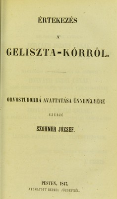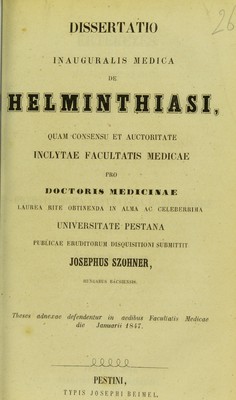 Dissertatio inauguralis medica de helminthiasi ... / publicae eruditorum disquisitioni submittit Josephus Szohner = Értekezés a' geliszta-kórról : orvostudorrá avattatása ünnepélyére / szerzé Szohner József.