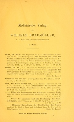 ![Z Arneth — Becker. Ariieth, Dr. F. H., suppl. Primarius am k. k. Gebärhause und an der Abtheilung für Frauenkrankheiten. Die geburtshilfliche Praxis, erläutert durch Ergebnisse der II. Gebärklinik in Wien und deren stete Vergleichung mit den statistischen Ausweisen der Anstalten in Paris, Dublin u. s. w. gr. 8. [VIII. 254 S.] 1851. 1 fl. 50 kr. — 3 M. — — Ueber Geburtshilfe und Gynaekologie in Frankreich, Grossbritannien und Irland. Grösstentheils nach Keiseergeb- nissen. gr. 8. [IV. 360 S.] 1853. 3 fl. — 6 M. Auspitz, Dr. Heilir., Professor der Dermatologie und Syphilis an der k. k. Universität, Director der allg. Polyklinik in Wien. Die Lehren vom syphilitischen Contagium und ihre thatsächliche Begründung, gr. 8. [X. 384 S.] 1866. 3 fl. 50 kr. — IM. System der Hautkrankheiten, gr. 8. [V. 254 S.] 1881. 3 fl. 50 kr. — IM. — und Professor Dl*. F. J. Pick. Vierteljahressehrift für Der- matologie und Syphilis, s. Vierteljahresschrift. Bade-Bibliothek, s. Braumüller's Bade-Bibliothek. Banibergei*. Dr. H. YOn, Hofrath und Professor an der k. k. Uni- versität in Wien. Lehrbuch der Krankheiten des Herzens. gr. 8. [VIII. 460 S.] 1857. 4 fl. — 8 M. (Vergriffen.) Becker, Dr. Otto, Professor der Augenheilkunde an der Universität in Heidelberg. Vier Tafeln zur Bestimmung des Astigma- tismus, gr. 4. [4 Taf. Reg.] 1868. 1 fl. 50 kr. — 3 M. — — Atlas der pathologischen Topographie des Auges. Ge- zeichnet von Dr. C. und J. Heitzmann. 1.—3. Lieferung. Mit 30 Tafeln und 7 Holzschnitten, gr. 4. 1874—1878. cart. 30 fl. — 60 M. 1. Lieferung-: [VIII. 32 S., Taf. 1—9 u. Deckbl. 4.] 1874. 9/. — 18 M. 2. „ [IV. 26 S., Taf. 10—18 u. Deckbl. 4.] 1875. 9 fl. — 18 M. 3. „ [VI. 47 S., Taf. 19-30 u. Deckbl. 4.] 1878. 12/. — 24 M. — — Photographisehe Abbildungen von Durchschnitten ge- sunder und kranker Augen. Gezeichnet von Friedrich Veith, photographirt von J. Schulze in Heidelberg. 1.—3. Serie, gr. 8. 1876. 1877. In Carton. 18 fl. — 36 M. 1. Serie: Tafel 1—10. [8 S., 10 Taf.] 1876. 6 fl. — 12 M. 2. „ Tafel 11—20. [4 S., 10 Taf.] 1876. 6 fl. — 12 M. 3. „ Tafel 21—30. [4 S., 10 Taf.] 1877. 6 fl. — 12 M. — — Die Anomalien der Refraetion und Accommodation des Auges, s. Don der s. Becker, Dr. H. T. VOn, erster Secundararzt des Kronprinz Rudolf- Kinderspitals. Zur Pathologie und Therapie der Rachen- Diphtherie. Mit Bezugnahme auf den Charakter der in Wien herrschenden Epidemie. Zwei Vorträge, gehalten im Verein der Aerzte in Nieder-Oesterreich, Section Wien. gr. 8. [IV. 72 S.] 1877. 80 kr. — 1 M. 60 Pf.](https://iiif.wellcomecollection.org/image/b2103560x_0330.jp2/full/800%2C/0/default.jpg)