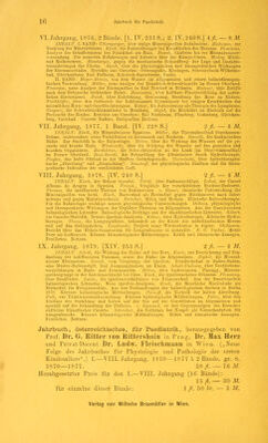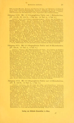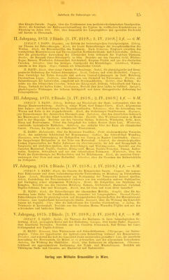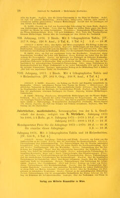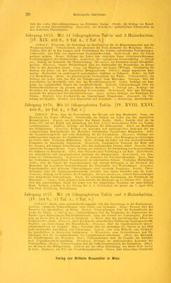 ![über die ersten Entwicklungsphasen von Pelobates fuscus. Olivetti, ein Beitrag zur Kennt- niss der ersten Allantoisbildung. Eisenschitz, zur Reform des pädiatrischen Unterrichtes an den deutschen Universitäten. Jahrgang 1875. Mit 11 lithographirten Tafeln und 2 Holzschnitten. [IV. XIX. 495 S., 9 Taf. 4., 2 Taf. 8.] INHALT: Winternitz, die Bedeutung der Hautfunction für die Körpertemperatur und die Wärmeregulation. Urbantschitsch, zur Anatomie der Tuba Eustachii des Menschen. Heitier, Studien über die in den Lungen nach Verletzungen des Gehirns auftretenden Veränderungen. Lütkemüller, vier Fälle von angeborenen Sacralgesehwülsten. Zuckerkandl, über die Fascia perinaei propria. Breuer, Beiträge zur Lehre vom statischen Sinne (Gleichgewichtsorgan, Vestibularapparat des Ohrlabyrinths). Leidesdorf, über epileptische Geistesstörung, v. Schroff jun., Beitrag zur Kenntniss der Chininwirkung. Obersteiner, zur Kenntniss einiger Hereditäts- gesetze. Hannover, fernere Mittheilungen über das Endresultat der Resectionen im Kriege 1864 in der dänischen Armee. Lang, zur Histologie des Lupus (Willani). Gleichzeitig ein Beitrag zur Lehre von den regressiven Metamorphosen. Scheiber, einige angeborene Ano- malien. Beobachtet im pathologisch-anatomischen Institute zu Bukarest. Heitier, ein Fall von Muskeltönen. Abeles, der physiologische Zuckergehalt des Blutes. Urbantschitsch, ein Beitrag zur Lehre über den Bau des Tubenknorpels beim Menschen. Galvagni, über die Auscultation der Mundhöhle oder über das Mundhöhlengerassel. Vajda, Beiträge zur Ana- tomie der syphilitischen Papeln der Geschlechtstheile. Hofmokl, Untersuchungen über die Blutdrnckverhältnisse im grossen und kleinen Kreislaufe, v. Schroff jun., Beiträge zur Kenntniss der Anordnung der motorischen Nervencentra. Zuckerkandl, über eine Bildungs- anomalie der männlichen Gesehlechtswerkzeuge. Spina, weitere Beiträge zur Histologie der Sehnen. Englisch, über Geschwülste am Samenstrange Neugeborner. Kassoivitz, die Ver- erbung der Syphilis. Stricker, über Abnormität und Krankheit, v. Rokitansky, Abschiedsrede. Jahrgang 1876. Mit 23 lithographirten Tafeln. [IV. XVIII. XXVI. 460 8., 20 Taf. 4., 3 Taf. 8.] INHALT: Weiss, über die Verwachsung des Herzens mit dem Herzbeutel. Lang, zur Histologie des Lupus (Willani). Gleichzeitig ein Beitrag zur Lehre von den regressiven Metamorphosen. Kaposi, zur Aetiologie des Herpes Zoster. Heitier, Bericht über die im Jahre 1875 auf der Klinik und Abtheilung des Prof. Löbel beobachteten Fälle von Typhus exanthematicus. Böhtling, Beiträge zur Kenntniss der Gefässnerven. Albert, zur Mechanik des Hüftgelenkes. Genersich, Beitrag zur Anatomie und pathologischen Anatomie der am sympathischen Bauchgeflechte des Menschen befindlichen Pacini'schen Körperchen. Rabl, das Granulationsgewebe und seine Bedeutung für die Scrophulosis. Bizzozero, Beiträge zur pathologischen Anatomie der Diphtheritis. Hof mann und Bosch, über Bewegungserscheinungen ara Cervix uteri. Vorläufige Mittheilung. Abeles, Beitrag zur Lehre von den saccharificirenden Fermenten im thierischen Organismus. Biesiadccki, Leukämische Tumoren der Haut und des Darmes, mit einigen Bemerkungen über den leukämischen Process selbst. Parenski, über embolische Darmgeschwüre. Feigel, Beitrag zur Aetinlopio der Entstehung von Incarcerationen der Gedärme im Bruchsacke. Dittel, über iutraarticuläre Verletzungen am Knie. Zuckerkandl, zur descriptiven und topographischen Anatomie der Znngenvenen. Zuckerkandl, zur Ana- tomie der Orbitalarterien. Zuckerkandl, zur Anatomie der Fusswurzelknochen. Spina, über das Vorkommen neugebildeter Formelemente in entzündeten Sehnen. Vorläufige Mittheilung. Sattler, über die Tapete der Sängethierangen und analoge Bildungen in der Aderhaut des Menschen mit besonderer Berücksichtigung des Elephanten- und Walfischauges. Rosenthal, Experimentelle und klinische Untersuchungen über cervicale Paraplegie. Gradle, Unter- suchungen über die Spannungsunterschiede zwischen dem linken Ventrikel und der Aorta. Neumann, Beitrag zur Kenntniss des Pemphigus. Burdon-Sanderson, weitere Untersuchungen über mitgetheilte Entzündungen. Bosch, die volumetrische Bestimmung des Blutdrucks am Menschen. — Langer, Rede, gehalten beim Antritte des Rectorats am 15. October 1875. Kaposi, über den gegenwärtigen Stand der Lehre von den pflanzlichen Parasiten der menschlichen Haut. Vortrag, gehalten in der Sitzung der k. k. Gesellschaft der Aerzte am 7. April 1875. Von Prof. Brodowsky, Berichtigung. Jahrgang 1877. Mit 24 lithographirten Tafeln und 9 Holzschnitten. [IV. 564 S., 17 Taf. 4., 7 Taf. 8.] INHALT: Hauke, neue pneumatische Apparate und ihre Anwendung in der Kinderpraxis. Loebisch, chemische Untersuchungen eines Falles von Cystinnrie. Mayer, Versuch über den Nachweis des Quecksilbers im Harne. Jarisch, Untersuchungen über die Bestandteile der Asche des Blutes. ». Schroff jun., Untersuchungen über die Steigerung der Eigenwärme des Hundes nach Rückenmarks-Durchschneidungen. Aeby, die Gestalt des Femurkopfes. Erwide- rung an Herrn Prof. E. Albert in Innsbruck, v. Bosch, über den physiologischen Effect der Esmareh'schen Binde. Bizzozero, über den Bau des menschlichen Peritoneum diaphragmaticum. Englisch, zur Entwicklung der Blasenbrüche. Neumann, über die hypodermatische Que'k- silberbehandlung der Syphilis. Meyer, Versuche über die Aufnahme des Chroms in das Blut nach äusserlicher Anwendung von Chromsäure. Ludwig, eine nene Methode zum Nachweis des Quecksilbers in thierischen Substanzen, v. Winitvarter, neue Beobachtungen und Er- fahrungen über die Arsenikmedication bei Lymphdrüsengeschwülsten. Albert, zur Mechanik des Schultergürtels des Menschen. Feuer, Untersuchungen über die Ursache der Keratitis nach Trigeminusdorchschneidung. Obersteiner, Beiträge zur pathologischen Anatomie der Gehirngefässe. Stricker, Untersuchungen über die. Gefässnervenwurzeln des Ischiadicus. Albert, zur Mec