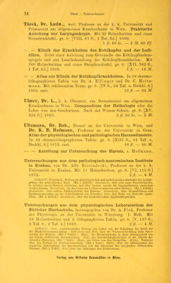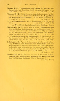![Wiener, Dr. J. Compendium der Chemie für Mediciner und Pharmaceuten, zur Bepetition für die strengen Prüfungen, gr. 8. [XVI. 164 S.] 1863. 1 fl. 50 kr. -31 WoillOW, Dr. M., Privat-Docent der Augenheilkunde an der k. Uni- versität in Moskau. Ueber das Verhalten der Doppelbilder bei Augenmuskel-Lähmungen. In 15 Tafeln dargestellt. 4. [8 S., 15 Taf. 4.] 1870. 2 fl. 50 kr. — 5 M. Ophthalmometrie. Mit 23 Holzschnitten, gr. 8. [VI. 130 S.] 1871. 1 fl. 20 kr. — 2 M. 40 Pf. und Dr. A.ßeuss, Ophthalmometrische Studien, s. Eeuss. Wolfenstein, Dr. N., prakt. Arzt in Brunn. Compendium der österreichischen Sanitätsgesetze und sanitätspolizeilichen Ver- ordnungen. Zum Gebrauche für Candidaten der Physikatsprüfung und der Thierarzneikunde, sowie für Bezirksärzte und Sanitäts- organe überhaupt, gr. 8. [IV. 436 S.j 1877. 3 fl. — 6 M. — — Pharmacognostisches Taschenbuch als Bepetitorium für Physikatscandidaten. Mit Bücksicht auf die sechste Ausgabe der österr. Pharmakopoe. 16. [IV. 196 S.] 1878. lfl. 30 kr. — 2 M. 60 Pf. Zehetmayer, Dr. F., weil. Professor an der k. k. Universität in Lem- berg. Lehrbuch der Percussion und Auscultation und ihrer Anwendung auf die Diagnostik der Brustfell- und Lungenkrankheiten, als Leitfaden zum Selbstunterricht für Aerzte dargestellt. Dritte verbesserte Auflage, mit einem Vorworte von Dr. Joh. Oppolzer, k. k. Hofrath und Professor, gr. 8. [XXX. 300 S.] 1854. 2 fl. 50 kr. — 5 M. Zuckerkandl, Dr. K, Professor an der k. k. Universität in Wien. Normale und pathologische Anatomie der Nasenhöhle und ihrer lufthaltigen Anhänge. Mit 22 Tafeln, gr. 8. (Unter der Presse.)](https://iiif.wellcomecollection.org/image/b2103560x_0366.jp2/full/800%2C/0/default.jpg)