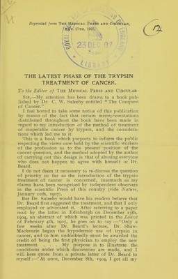 Credit: The latest phase of the trypsin treatment of cancer / [J.A. Shaw-Mackenzie]. Source: Wellcome Collection.