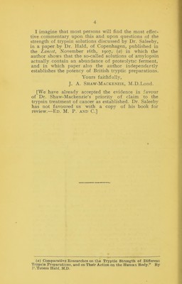 The latest phase of the trypsin treatment of cancer / [J.A. Shaw-Mackenzie].