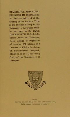 Credit: Reverence and hopefulness in medicine / by Sir Dyce Duckworth. Source: Wellcome Collection.