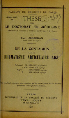 De la contagion dans le rhumatisme articulaire aigu : thèse pour le doctorat en médecine présentée et soutenue le jeudi 20 juillet 1905, à 1 heure / par Paul Josseran ; président M. Debove, juges MM. Troisier, Jeanselme, Bezançon.