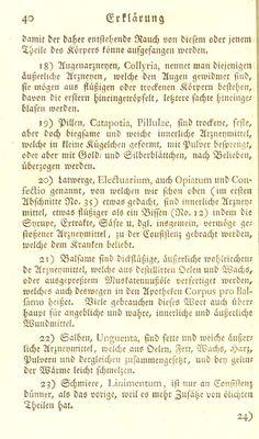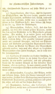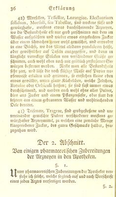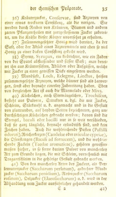 ![36) ^rduterjucfer, Confcrvae, ftnb 7irjiict)en von einer envaö trocfnern (^on)7|lenj, alö Die üortijen. ©ie tnerDeii bucc^ Oietben üon itraurern, Blumen iinb mibent jarten ^fTanjembeileii mit jangefioiyeiieni juberei? m, um bie Grafte biefer Körper imücife^rt ju erbnitciu 37) JT^oniv} miib bereitet, ba bec ©aft, ober ber 2ibfub eines 2lr^nepmittels mit eben fo öiel »^enig jU einer bafen (jenfifienj ^efoebt mirb« 38) ©ptiip, Syrupus, ein flebricbter, mic ein ^abetr tjon ber ©patel ab^ie)Tenbcr unb fit|yer ©afr; man berei; tet i^n aus .^rduterfdften, ^ibfüben ober l^l'ufgufTen, meiere mit gemijyen 3^irfe eingefotten werben. 39) Sliunbfaft, Loch, Eclegma, Lindus, §ei^eu jufammengefef^te 'Jtrjnepen, welche bunner finb als iatwer; gen, fonfl aber bei;nabe einerlei; 3tt^>^t'c'itung haben. (Sbeii t)on bergleichen 2lrt i^ auch ^Jiarmelabe ober Miva. 40) dvuchelchen, auch ©terndugelchen, Trochifeus, be|7eht aus ^uloeni, (Srtraften u. bgl. bie mit 3ticFß>*/ ©chleim, ©tdrfmehl u. b. angemacht unb in bie 0ef7alt »on plattrunben, auf bepben ©eiten bc^eichneten, ganj utt? burchfichtigen ^'ücl)elchen gebracht werben; baoon fInb bie ©tengel, baculi ober bacilli nur in fo weit üerfchieben, ba§ |7^ ganj Idnglicht, beinahe cplinbrifcf) finb, unb fein 3eichen haben. 2lud) bie wohlriechenbe ^a|7en (Paftilli oc]orati),9beicherferjen (Cancidaeoberaviculaecypriae), bie Dfenflangen (Baculi ad fornacem), unb bie wohlrie; chenbe (l’aedae aromaticae), gehören gewiffer# mähen \^’\d)zx, in fo ferne barinn 9)uloer oon mandierlei; ?lrt jum 0runbe liegen, bie mit ©d)leim, vornehmlich mit ^ragantfchleim in bie gehörige 0e}7alt gebracht werben. 41) C8on ben mancherlet; Wirten bes 3wd'ers, als 'TDer? lemutter;^ucb'er (Saccharum perlatiim), gebrohter ^inb? juefer (Saccharum penidium), iTiofenpicfer (Saccharum rolatum), Deljucfer (Elaeohiccharum) u. b. wirb in bet* 2lbhanblung vom3wcfer ausführlicher gelpaubelt werben. C 3 42)](https://iiif.wellcomecollection.org/image/b28761716_0055.jp2/full/800%2C/0/default.jpg)