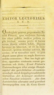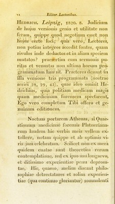 ![ERNESTI PLATNERI FROFESSORXS QVONDAM MEIJICI IN ACADEMIA LIVSIENSI QVAESTIONES MEDICINAE FORENSIS ET MEDICINAE STVDIVM OCTO SEMESTRIBVS DESCRIPTVM. PRIMO lYNCTIM EDIDIT INDICEM COPIOS™ ET VITAM PLATNEIU A D I E C I T LYDOVICVS CHOVLANT MED. ET CHIR. DOCTOR , ]N ACADEMIA CHIR. MED. DRESDK>fSI PUOFE3SOII ET INSTITVTI POLICLINICI DIHECTOR , NOSOCUMII ..^^'^ ELISABETHINI MEDICVS ORDINARIVS. / » - , ^ \, Ldcceclit effigics Plaineri. L I P S I A E, A P V T) L E O P O T, D V M V O S S. 1 8 2 4.](https://iiif.wellcomecollection.org/image/b21966898_0011.jp2/full/800%2C/0/default.jpg)
