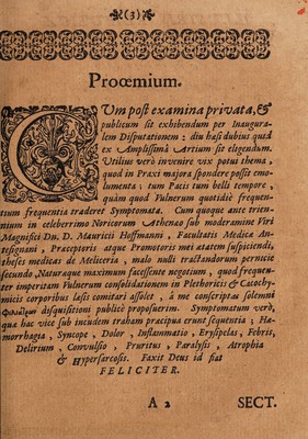 Credit: Disputatio medica inauguralis, de vulnerum symptomatibus, ... / sub praesidio ... Jacobi Israelis ... Publicae eruditorum censurae exponit Johannes Georgius Carisius, ... Ad diem XIII. Martii, A. MDCLXXIII. Source: Wellcome Collection.