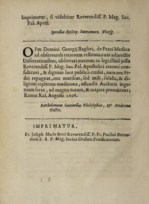 Opera omnia medico-practica et anatomica / hac sexta editione, post ultimam Ultrajectinam aucta, novisque locupletata dissertationibus, epistolis & praefatione quae systematis Bagliviani usum aperit, adversariorumque diluit objectiones. Accedit tractatus de vegetatione lapidum opus disideratum nec non De terraemotu Romano, & urbium adjacentium anno 1703.
