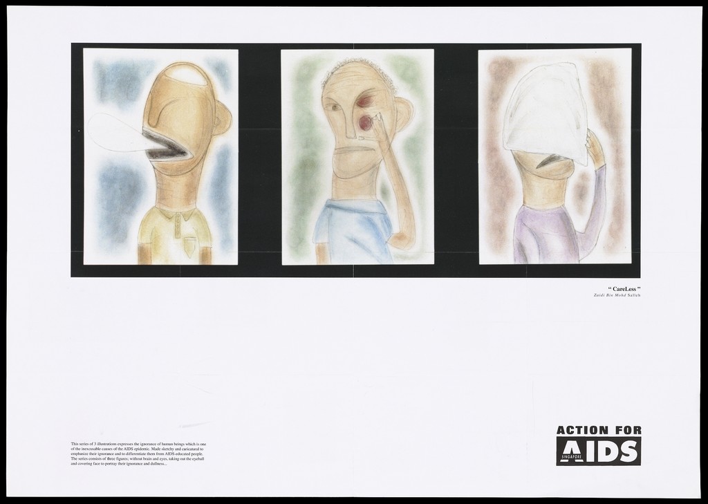 Credit: Three figures: one without a brain and eyes, one removing an eyeball, and the third covering his face; representing turning a blind eye to AIDS; with an illustrated calendar of events to mark World AIDS Day 1996. Colour lithograph after Zaidi Bin Mohd Salleh and others for Action for AIDS Singapore, 1996. Source: Wellcome Collection.