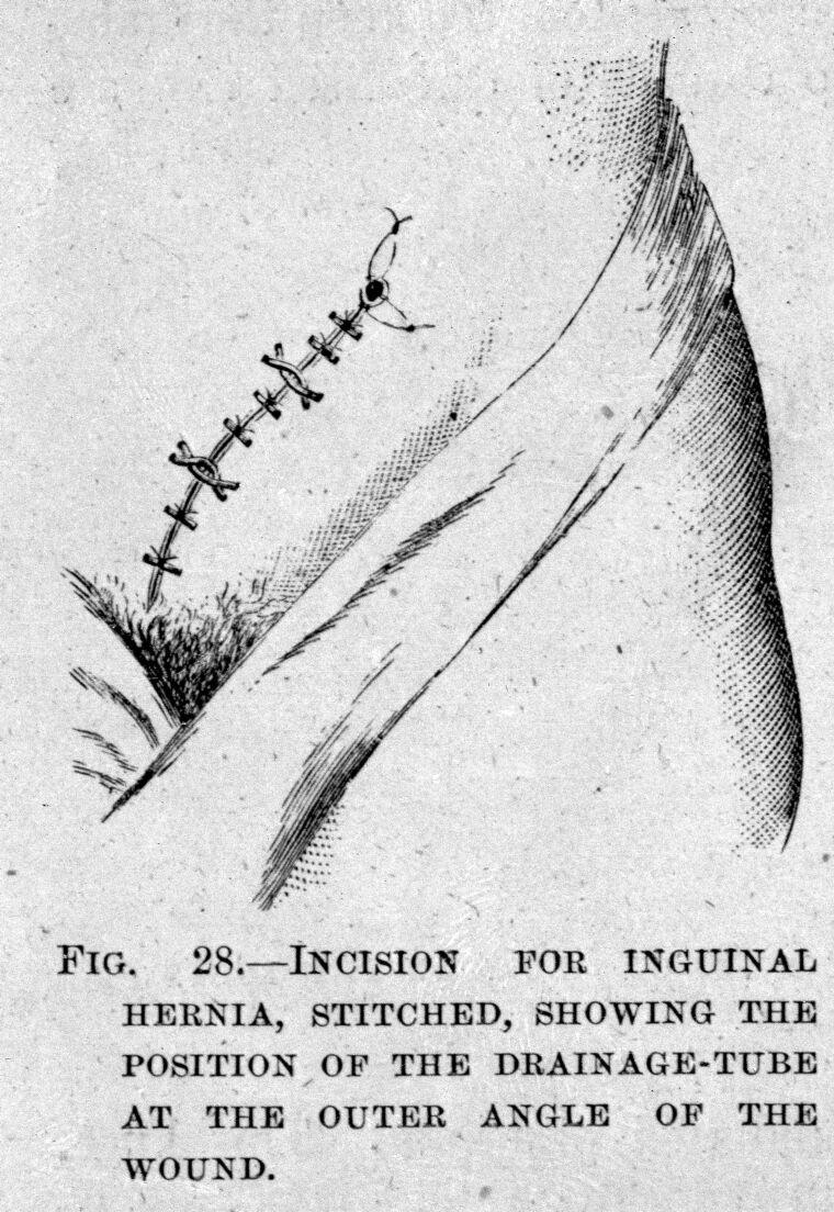 M0007800: Incision for inguinal hernia, from Cheyne: <i>Antiseptic Surgery</i> (1882). Public Domain Mark. Source: Wellcome Collection.
