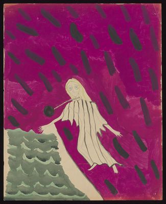 Credit: A woman with a weight attached to her neck by a chain with a body of water to her left on a pink and purple ground. Source: Wellcome Collection.