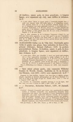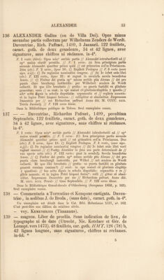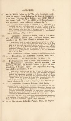 ![127 ALEXANDER Gallus (ou de Villa Dei). Doctrinalis partes tertia et quarta. Sans indication de lieu, de typographe ni de date. (Déventer, Rich. Paffroet, vers 1484.) 22 feuil- lets, caract. goth. HMT. 64 (112) b, 28 lignes longues, avec signatures, sans chiffres ni réclames, in-4®. F. 1 recto {titre): Tertia et quarta ps doctrinalis // F. 1 verso blanc. F. 2 recto {avec sign. aij): (p) Andere pposui per versus // syllaba quæqS // etc. F. 15 recto, ligne 10: Finit tercia ps doctrinal’ foeliciter // F. 15 verso: (a) Ccëtas varias decet Fine // distinguere norma’ // F. 22 recto, ligne 5 : Alexandri gramniatici doctrinale // finit foeliciter. // F. 22 verso blanc. Dans la Bibliothèque publique de Trêves. 128 — — Daventriae, Jacobus de Breda, 1496, d. 8 m. Octo- bris. 22 feuillets, caract. goth., 29 lignes longues, avec signatures aij—diij, sans chiffres ni réclames, in-4^ F. 1 recto {titré): Tercia et quarta // pars Alexandi'i. // suit une xylogra- phie, le symbole des quatre Evangélistes HMT. 66 (114) fl. X 1 verso blanc. F. 2 recto {avec sign. aij): (P) Andere pposui p :e-sus syll’a qq3// F. 21 verso, ligne 8: Q1 Alexandri grammatici doctrinale finit// féliciter Jmpressuni Dauentrie. Per nie // Jacobum de Breda. Anno^ domini Mille // simo quadringentesimo nonagesimo se- // xto. viij. inësis Octo- bris. /! F. 22 blanc. Dans la collection de M. le Sénateur Vergauwen, à Gand. Edition non décrite. [29 Daventriae, per Richardum Paffroet, 1499. in-4®. Cité par Pauzer, IV, 288, 129 b; Hain 740; Cat. Kloss, n». 92. 130 — Doctrinalis partes tertia et quarta cum commente (Kem- ponis Thessaliensis?). Daventriae, Jacobus de Breda, 1490 d. 22 m. Octobris. 34 feuillets,'caract. d. goth. de deux grandeurs, à longues lignes, avec signatures aiij—eiij, sans chiffres ni réclames, in-4®. F. 1 recto {titre): Tercia et qrta pars alex // andri cü optimo omento j F. 1 verso blanc. F. 2 recto: Q1 Tercia pars Alexandri. 7 Capitnlu deoimnin de quantitatibus syllabal^ // F. 34 recto a la fin: (]1 Et sic finitur expositio doctrinalis Alexandri. Jm // pressa danantriç. xx/j. mensis Octobris Per me Ja- // cobum de breda. Anno incarnationis diiicg Mil- lesi- // mo quadringentesimo Nonagesimo // F. 34 verso blanc. Dans la collection de M. le Sénateur Vergauwen, à Gand. Cité nulle part. 131 Daventriae, Richardus Pafraet, 1495. in-4to. VIntitulé: Tertia et quarta partes doctrinalis magistri Alexandri cum com- mento valde utili textus dante intelligentiam summariam. Quarum tertia docet de quantitate Sijllabarum. Quarta uero de accentuatione cum nouis quibusdam sententiarum additionibus. La souscription: Alexandri gram- matici due partes: tercia videlicet et quarta fiuiunt féliciter. Impresse Dauentrie per Richardum pafraet. Anno dni. M. CCCC. XCV. Panzer (XI, 319, 87 d et 97 d) en donne la description d’après l’exemplaire en sa possession. Voyez aussi Hain, n®. 14759 et Kloss Cat. n®. 91 où il est dit que l’auteur du commentaire s’appèlle Kempo Thessaliensis. 132 Daventriae, Richardus Pafraet, 1497, 19 Augusti.](https://iiif.wellcomecollection.org/image/b28994814_0055.jp2/full/800%2C/0/default.jpg)