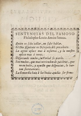 Credit: Canones particulares de cirugìa : con que se libertan muchos desahuciados, si al sagrado de sus fuentes se refugian. Source: Wellcome Collection.