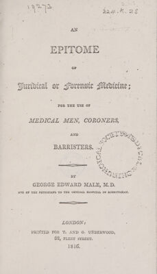 An epitome of juridical or forensic medicine; for the use of medical men, coroners, and barristers / By George Edward Male.