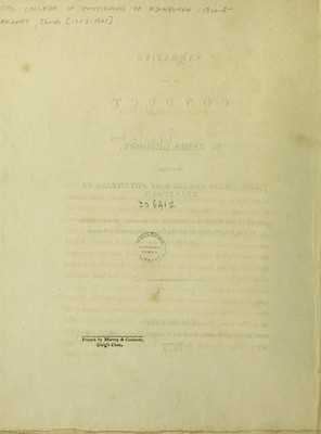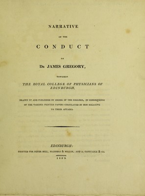 Narrative of the conduct of Dr. James Gregory, towards the Royal College of Physicians of Edinburgh, drawn up and published by order of the College, in consequence of the various printed papers circulated by him relevant to their affairs.