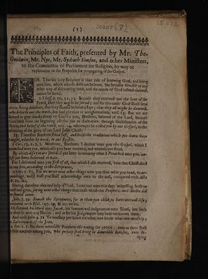 The principles of faith / presented by Mr. Tho. Goodwin, Mr. Nye, Mr. Sydrach Simson, and other ministers to the Committee of Parliament for Religion, by way of explanation to the Proposals for propagating of the Gospel.