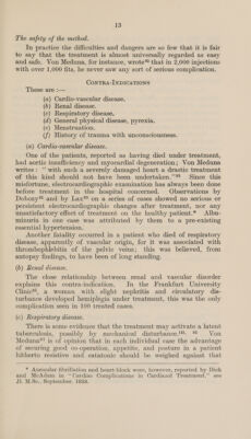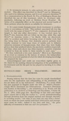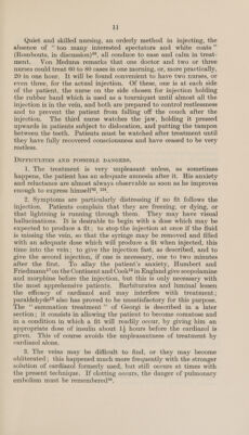 ![1] Quiet and skilled nursing, an orderly method in injecting, the absence of ‘too many interested spectators and white coats ”’ (Rombouts, in discussion)*, all conduce to ease and calm in treat- ment. Von Meduna remarks that one doctor and two or three nurses could treat 60 to 80 cases in one morning, or, more practically, 20 in one hour. It will be found convenient to have two nurses, or even three, for the actual injection. Of these, one is at each side of the patient, the nurse on the side chosen for injection holding the rubber band which is used as a tourniquet until almost all the injection is in the vein, and both are prepared to control restlessness and to prevent the patient from falling off the couch after the injection. The third nurse watches the jaw, holding it pressed upwards in patients subject to dislocation, and putting the tampon between the teeth. Patients must be watched after treatment until they have fully recovered consciousness and have ceased to be very restless. . DIFFICULTIES AND POSSIBLE DANGERS, 1. The treatment is very unpleasant unless, as sometimes happens, the patient has an adequate amnesia after it. His anxiety and reluctance are almost always observable as soon as he improves enough to express himself®, 124, 2. Symptoms are particularly distressing if no fit follows the injection. Patients complain that they are freezing, or dying, or that lightning is running through them. They may have visual hallucinations. It is desirable to begin with a dose which may be expected to produce a fit; to stop the injection at once if the fluid is missing the vein, so that the syringe may be removed and filled with an adequate dose which will produce a fit when injected, this time into the vein; to give the injection fast, as described, and to give the second injection, if one is necessary, one to two minutes after the first. To allay the patient’s anxiety, Humbert and Friedmann*’ on the Continent and Cook® in England give scopolamine and morphine before the injection, but this is only necessary with the most apprehensive patients. Barbiturates and luminal lessen the efficacy of cardiazol and may interfere with treatment; paraldehyde! also has proved to be unsatisfactory for this purpose. The ‘summation treatment ’”’ of Georgi is described in a later section; it consists in allowing the patient to become comatose and in a condition in which a fit will readily occur, by giving him an appropriate dose of insulin about 14 hours before the cardiazol is given. ‘This of course avoids the unpleasantness of treatment by cardiazol alone. 3. The veins may be difficult to find, or they may become obliterated; this happened much more frequently with the stronger solution of cardiazol formerly used, but still occurs at times with the present technique. If clotting occurs, the danger of pulmonary embolism must be remembered*®,](https://iiif.wellcomecollection.org/image/b32182648_0013.jp2/full/800%2C/0/default.jpg)