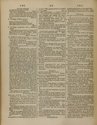 ![Kfi/pia-ictoif of ctfitpt and arx.101 a shadow.] Those people dwelling in climates, wherein the shadows, at different times of the year, fall both ways; to the north pole, when the sun is in the southern signs; and to the south pole, when he is in the northern signs. These are the people who inhabit the torrid zone. Amfhithe'atre, am-fe-Me'a-tur.816 n.s [ot <zp.<pt6ixTgov, of af*4>i and 6i<io/xxi.^ A building in a circular or oval form, having its area encompassed with rows of seats one-above another; where spec- tators might behold spectacles, as stage-plays, or gladiators. The thea- tres of the ancients were built in the form of a semicircle only exceeding a just semicircle by one-lourth part ol the diameter; and the amphitheatre is two theatres joined together; so that the longest diameter of the amphithea- tre was to the shortest, as one and a half to one. Within, an amphitheatre appear'd Rais'd in degrees; to sixty paces rear'd, That when a man was plac'd in one degree, Height was allow'd for him above to see. Dryden. Conceive a man placed in the burning iron chair at Lyons, amid the insults and mockeries of a crowded amphitheatre, and still keeping his seat; or stretched upon a grate of iron, over coals of fire, and breath- ing out his soul among the exquisite sufferings of such a tedious execution, rather than renounce his religion, or blaspheme his Saviour. Mdison. A'MPLE, am'pl.408 adj. [_amplus, Lat.J 1. Large; wide; extended. Heav'n descends In universal bounty, shedding herbs, And fruits, and flowers, on Nature's ample lap. Thomson. 2. Great in bulk. Did your letters pierce the queen to any demon- stration of grief? She took 'm and read 'm in my presence, And now and then an ample tear trill'd down Her delicate cheeks. Shakspeare's King Lear. 3. Unlimited; without restriction. Have what you ask, your presents I receive; Land where and when you please, with ample leave Dryden. 4. Liberal; large; without parsimony. If we speak of strict justice, God could no way have been bound to require man's labours in so large and ample manner as human felicity doth im- port; in as much as the dignity of this exceedeth so far the other's value. Hooker. 5. Magnificent; splendid. To dispose the prince the more willingly to un- dertake his relief, the earl made ample promises, that within so many days after the siege should be raised, he would advance his highness's levies with two thousand men. Clarendon. 6. Diffusive; not contracted; as, an am/ile narrative, that is, not an epitome. Vmpleness, am'pl-ness. n. s. [from am- ple] The quality of being ample; large- ness; splendour Impossible it is for a person of my condition to produce any thing in proportion either to the ample- ness of the body you represent, or of the places you bear. South. To A'mpliate, am'ple-ate. v. a. [amplio, Lat.] To enlarge; to make greater; to extend. He should look upon it, not to traduce or extenu- ate, but to explain and elucidate, to add and ampli- ate. Brown. Amplia'tion, am-ple-a'shun. n. s. [from ampliate.] 1. Enlargement; exaggeration; extension. Odious matters admit not of an ampliation, but ought to be restrained and interpreted in the mild- est sense. Jlyliffe's Parergon. 2. Diffuseness; enlargement. The obscurity of the subject, and the prejudice and prepossession of most readers, may plead excuse for any ampliations or repetitions that may be found, whilst I labour to express myself plain and full. Holder. To Ampli'ficate, am-plif'e-kate. v. a. [ampli/ico, Lat.J To enlarge; to spread out; to amplify. Diet. Amplification, am-ple-fe-ka'shun. n. s. [amplification, Fr. amplification Lat.J 1. Enlargement; extension. 2. It is usually taken in a rhetorical sense, and implies exaggerated representation, or diffuse narrative; an image height- ened beyond reality; a narrative en- larged with many circumstances. I shall summarily, without any amplification at all, shew in what manner defects have been sup- plied. Davies. Things unknown seem greater than they are, and are usually received with amplifications above their nature. Brown's Vulgar Errours. Is the poet justifiable for relating such incredible amplifications? It may be answered, if he had put these extravagancies into the mouth of Ulysses, he had been unpardonable; but they suit well the cha- racter of Alcinous. Pope. A'mplifier, am'ple-fi-ur.98 n. s. [from To amplify^ One that enlarges any- thing; one that exaggerates; one that represents any thing with a large dis- play of the best circumstances; it be- ing usually taken in a good sense. Dorillaus could need no amplifiers mouth for the highest point of praise. Sidney. To A'mplify, am'ple-fi.183 v. a. [ampli- fier, Fr.] 1. To enlarge; to increase any material substance, or object of sense. So when a great monied man hath divided his chests, and coins, and bags, he seemeth to himself richer than he was: and therefore a way to amplify any thing, is to break it, and to make anatomy of it in several parts, and to examine it according to the several circumstances. Bacon. All concaves that proceed from more narrow to more broad, do amplify the sound at the coming out. Bacon. 2. To enlarge; or extend any thing incor- poreal. As the reputation of the Roman prelates grew up in these blind ages, so grew up in them withal a de- sire of amplifying their power, that they might be as great in temporal forces, as men's opinions have formed them in spiritual matters. Raleigh. 3. To exaggerate any thing; to enlarge it by the manner of representation. Thy general is my lover; I have been The book of his good acts; whence men have read His fame unparallel'd, hap'ly amplified. Shaksp. Since I have plainly laid open the negligence and errors of every age that is past, I would not willing- ly seem to flatter the present, by amplifying the di- ligence and true judgment of those servitours that have laboured in this vineyard. Davies 4. To enlarge; to improve by new addi- tions In paraphrase the author's words arc not strictly 