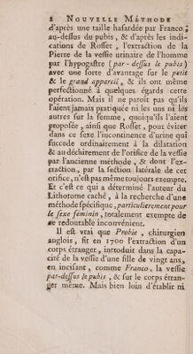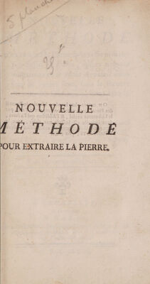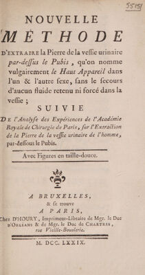 Nouvelle méthode d'extraire la pierre de la vessie urinaire par-dessus le pubis, qu'on nomme vulgairement le haut appareil ... sans le secours d'aucun fluide retenu ni forcé dans la vessei; suivie de l'analyse des expériences de l'Académie Royale de Chirurgie de Paris, sur l'extraction de la pierre de la vessie urinaire de l'homme, pardessus le pubis / [Anon].