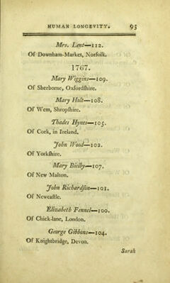 Credit: Human longevity: recording the name, age, place of residence, and year, of the decease of 1712 persons, who attained a century, & upwards, from A.D. 66 to 1799, comprising a period of 1733 years. With anecdotes of the most remarkable / by James Easton. Source: Wellcome Collection.