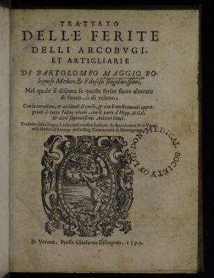 Credit: Trattato delle ferite delli arcobugi et artigliarie ... nel quale si disputa se queste ferite siano alterate di fuoco, ò di veleno; con la curatione, et accidenti di quelle, e con li medicamenti appropiati à tutte l'altre ulcere ... / Tradotto dalla lingua latina nella nostra italiana da Bartolomeo Poli. Source: Wellcome Collection.