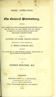 Third vindication of the General Penitentiary : showing that there is no ground whatever for supposing that the situation of that prison had any share in producing the late disease among the prisoners confined there. Being an answer to some observations contained in a work published by P. Mere Latham, entitled "An account of the disease lately prevalent at the General Penitentiary." / by George Holford.