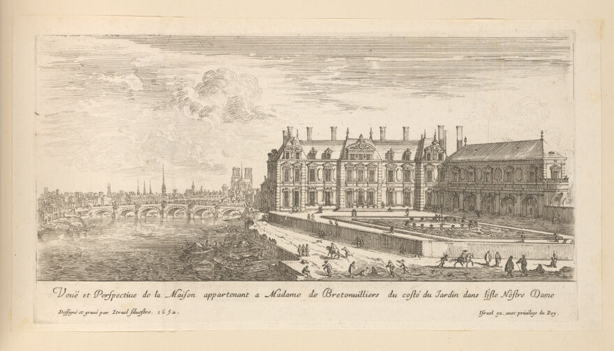 Credit: The house of Madame de Bretonvilliers on the Isle de la Cite.́ Etching by Israel Silvestre. Source: Wellcome Collection.