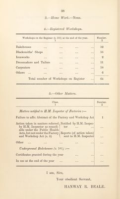 ![FACTORIES, WORKSHOPS, WORKPLACES AND HOMEWORK. 1.—Inspection oj Factories, Workshops and Workplaces. (Including Inspections made by Sanitary Inspectors or Inspectors of Nuisances). Premises 1 Number of Inspec- tions 2 Written Notices 8 Prosecu- tions 4 Factories (including Factory Laundries) 5 • • • • • • Workshops (including Workshop Laundries) 60 • • • • • • Workplaces (other than Outworkers’ premises included in Part 3 of this Report) 3 1 • • • TOTAL 68 1 • • • 2.—Defects found in Factories, Workshops and Workplaces. No. of Defects Number Particulars 1 Found 2 Reme- died 8 Referred toH.M I’spector 4 of Prosecu- tions 5 Nuisances under the Public Health Acts:— Want of cleanliness.... * * » • « • • • • • • « 7 7 • • • • • 0 Want of ventilation . .. • ••• • • • • •••• 3 3 • • • Overcrowding .... * • • • • • • * ■ • • o • e • • • • • • • Want of drainage of floors .... .... .... 2 2 • • • Other nuisances .... • • • • S • • t • • 1 • • • • • • • • • • ] insufficient .. .... 1 1 • • • Sanitary accommodation s unsuitable or defective • • • • • • • • • J not separate for sexes Offences under the Factory and Workshop Act:— • • • • • • • • • Illegal occupation of underground bakehouses (s 101) Breach of special sanitary requirements for bake- • • • • * • • • • • » • houses (ss. 97 to 100) • • • • •••• •••• • • • • • • • • • • • • Other offences .... . . .... (Excluding offences relating to outwork which are included in Part 3 of this Report) • • • • • • • • • Total .... .... 13 13](https://iiif.wellcomecollection.org/image/b29184307_0037.jp2/full/800%2C/0/default.jpg)