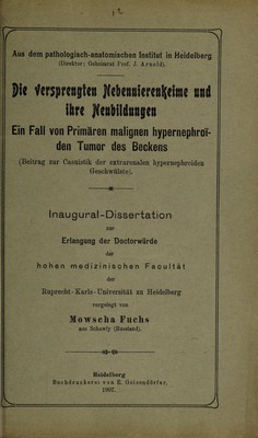 ![Aus dem pathologisch-anatomischen Institut in Heidelberg (Direktor: Geheimrat Prof. J. Arnold). Die Versprengtet] jlebennierenKelme nnd ihre Ifenbildnngen Ein Fall von Primären malignen hypernephroi- den Tumor des Beckens (Beitrag zur Casuistik der extrarenalen hypernephroiden Geschwülste), ---- Inaug ural-Dissertation zur Erlangung der Doctorwürde der hohen medizinischen Facultät der Ruprecht - Karls - Universität zu Heidelberg vorgelegt von Mowscha Fuchs aus Schawly (Russland). -<^...^>—-- Heidelberg Buehdruckerei von E. Geisendörfer. 1907.](https://iiif.wellcomecollection.org/image/b30610771_0001.jp2/full/800%2C/0/default.jpg)