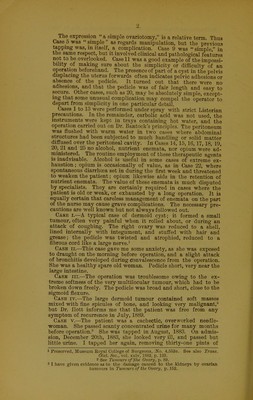 ![[Reprinted for the Author from the British Medical Journal, Dec. 14, 1889.] A SERIES OF TWENTY-FIVE COMPLETED OVARIOTOMIES. By ALBAN DORAN, F.R.C.S., Surgeon to the Samaritan Free Hospital. Notwithstanding all that has been written concerning ovario- tomy, there is yet more to be learnt about the subject. Between April, 1877, when I became assistant-surgeon to the Samaritan Hospital, and October, 1889,1 witnessed no less than 1,050 abdo- minal sections. I assisted in person at over half those operations, after clinical examination of nearly every patient, in Dr. Ban- tock’s wards. Yet, spite of that experience, which cannot be reckoned as limited, I should be sorry to speak too positively on any of the contested points relating to ovariotomy and allied pro- cedures. Practice of the operation, a searching investigation into every detail of nursing and after-treatment, and a close study of the records and statistical tables of experienced operators, are the chief agents in effecting progress. The cause of death in fatal cases must, whenever possible, be faithfully recorded. Every operator tends to put his trust in a system; he must find out how the system fails in every bad case, and must admit, if necessary, that the system may have been the cause of death. He must avoid a natural tendency to argue, on mere logical grounds, that his colleagues’ fatal cases are due to his colleagues’ respective systems, and that his own are to be explained by purely acci- dental circumstances for which his system and himself are in no way to blame. On the other hand, the less experienced operator must not take for granted that the success of a senior is due, as that senior may honestly believe and maintain, to his system. The senior’s brilliant results must depend, to a great extent, on his skill and experience, rather than on preference for the spray, or discarding of antiseptics, or treatment of peritonitis by opium or by purgatives. A few years ago, in the course of a discussion on the claims of eminent rivals, at the Royal Medical and Chirurgical Society, Mr. Savory observed that there was only one thing com- mon to both claimants. Their last cases were more successful than their first. This showed that success depended on the man rather than on his system. In my own practice I have taken what has been sent to me; some of the cases were easy, some difficult, I made no selection. To give full details of every case would be an impossibility. Yet since ovariotomy depends, perhaps, more upon matters of detail and care in after-treatment than any other operation, I have thought it advisable to append to the table a series of notes on matters of interest respecting each case. I regret that one im- portant and indeed essential factor, the efficacy of the nurse, can- not be estimated in statistical records.](https://iiif.wellcomecollection.org/image/b22456776_0003.jp2/full/800%2C/0/default.jpg)