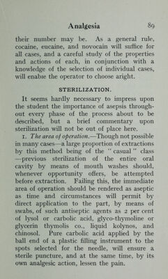 ![and its toxicity is rated as one-third that of cocaine. It is said to have a toxic action on the heart. The dose is ^ to i gr.. and | to i per cent solutions may be used, though some writers recommend as high as 3 to 4 per cent. The analgesia obtained is very powerful. Acoin, Ansesthesine, Holocaine Hydro- chloride, and Nirvanin have also found a place in the long list of local analgesics, but proved unsuitability for the purpose, or want of sufficient experimental data, debars them from further mention at the present time, though it may be said of nirvanin that a future is predicted for it by American writers. It is freely soluble to form neutral solutions possessing germicidal properties, and has an estimated toxicity one-tenth that of cocaine, as much as 7 gr. having been injected at one time without complications. Analgesics can be obtained :— 1. In liquid form, either {a) in bottles, or {b) in sealed sterilized glass ampoules each containing a known quantity of solution of standard percentage strength. 2. In solid form, for solution in water. Of these i [b] and 2 are recommended. ANALGESIC MIXTURES. Of the numerous substances which have](https://iiif.wellcomecollection.org/image/b21511329_0097.jp2/full/800%2C/0/default.jpg)