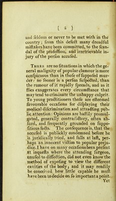 ![[ 3 ] and feldom or never to be met with in the country; from this defeft many dreadful miftakeshave been committed, to the fcan- dal of the profeffion, arid irretrievable in- jury of the perlbn accufed. Th ere are no fituations in which the ge- neral malignity of popular clamour is more confpicuous than in thofe of fuppoled mur- der: no fooner is a perfon fufpe&ed, than the rumour of it rapidly fpreads, and as it flies exaggerates every circumftance that may tend to criminate the unhappy culprit. To young praftitioners thole are efteemed favourable occafions for difplaying their medical difcrimination and attrafting pub- lic attention: Opinions are haftily promul- gated, generally contradi&ory, often ab- furd, and frequently grounded on fuppo- fitious fa fits. The confequence is, that the accufed is publickly condemned before he is juridically tried, and falls at laft, per- haps an innocent vifitim to popular preju- dice. I have on many occafionsbeen prefent at inquefts where the attending furgeon, unufed to dilfefition, did not even know the method of expoiing to view the different cavities of the body; and it may readily be conceh ed how little capable he mull have been to decide on fo important a point. Yet](https://iiif.wellcomecollection.org/image/b20443973_0012.jp2/full/800%2C/0/default.jpg)