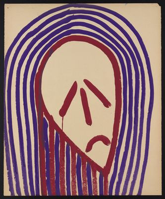 A head tilted to left with downturned mouth, surrounded by curved red and purple lines