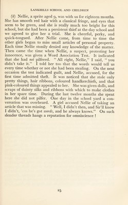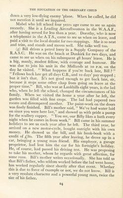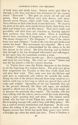 ![of leafy trees and shady lawn. Sixteen senior girls filter in through a side door and move into formation for the country dance “ Newcastle The girls are nearly all tall and well grown. They wear well-cut navy gym dresses, with short- sleeved cream blouses, white ankle socks, and rubber shoes. Navy ribbons on their trim heads secure their hair. We observe the poise of the girls, their sturdy brown limbs, their fresh clear skins and bright eyes, and they dance. They move easily and gracefully, and their faces are vivacious as, dancing opposite their partners, they flash little smiles. There is something elusive here, something of happiness, of gay spirit, of beauty. The dance changes to “ The Dargason ”. One of the visitors leans over and whispers, “ Look at the way that girl [indicates] carries her head. Her movements are exquisite. She is very attractive.” Gladys is acknowledged by the others to be the best dancer in the school. She loves dancing, and we believe that through it she has developed self-control and self-respect. In her spare time she sometimes coaches a team. Gladys left school three months ago. She is a parlourmaid, and earns her own living. She writes us “ newsy 5 5 letters and says she has joined a club for country dancing. (c) Visitors have come this Friday afternoon to the kitchen to see the beginning of a cookery lesson. The girls were given their assignments last Tuesday so that they could think over and plan their work. They come now into the kitchen and each goes to cupboards and collects the utensils she needs. Along one side of the kitchen beneath three large windows is a built-in table-top 23 feet long on which are spaced three sets of scales and weights. Quantities of the raw materials that are in the greatest demand, like flour and sugar, are similarly spaced to afford ease of access. The girls take and weigh out or measure the materials they require. The teacher, who has been talking with the visitors, moves round the room observing, asking a quiet question here and there. The visitors watch Isobel, who has hair of real Titian hue under her pretty cap. She is making sausage rolls, and is busy with flaky pastry. She has a card of written instructions and diagrams. As she com¬ pletes the rolling of the pastry, she pauses to study the card. Inquiry reveals that Isobel has made flaky pastry once before, a fortnight ago when she made jam tarts. There is Daphne, a](https://iiif.wellcomecollection.org/image/b29818813_0025.jp2/full/800%2C/0/default.jpg)